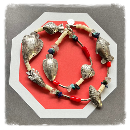 Zilveren vissen en schelpen afgewisseld met been, kweekkoraal en glasparels. 42 cm (kort in de hals) -