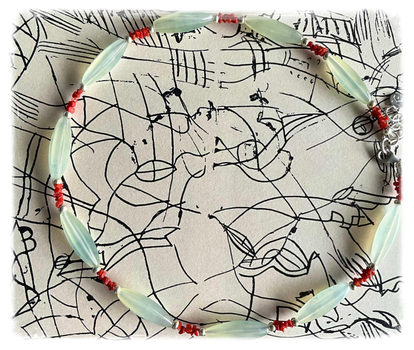 Mooie kegelvormige en doorzichtige licht mosgroene serpentinekralen afgewisseld met kweekkoraal. Heel fragiel en mooi in eenvoud. (53 cm) . Oorbellen met dezelfde kralen te verkrijgen. Zie oorbellen-pagina