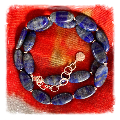 Mooie ovalen kralen met zilveren spacers en voldoende schakels om lengte aan te passen. Prachtige kleur.