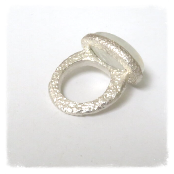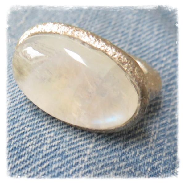 Cabochon van regenboogmaansteen verwerkt in een koraalstructuur ring vn g925 zilver. Wat spreekt er meer tot de verbeelding? Voortdurend weerkaatst er een andere kleur in de steen van 2 cm lengte op 1 cm.