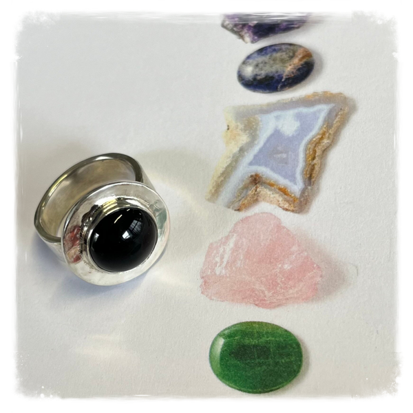 Deze diepzwarte onyxsteen werd mooi in een rond sterling zilveren draagblak gezet. Zeer elegant en klassiek. enkel in de maten 56 en 57 verkrijgbaar