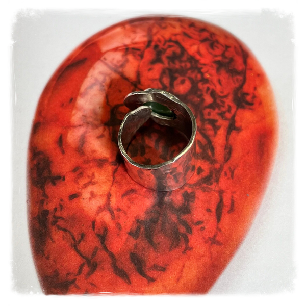 Open ring met aparte vorm en ovale cabochon van groene jade.