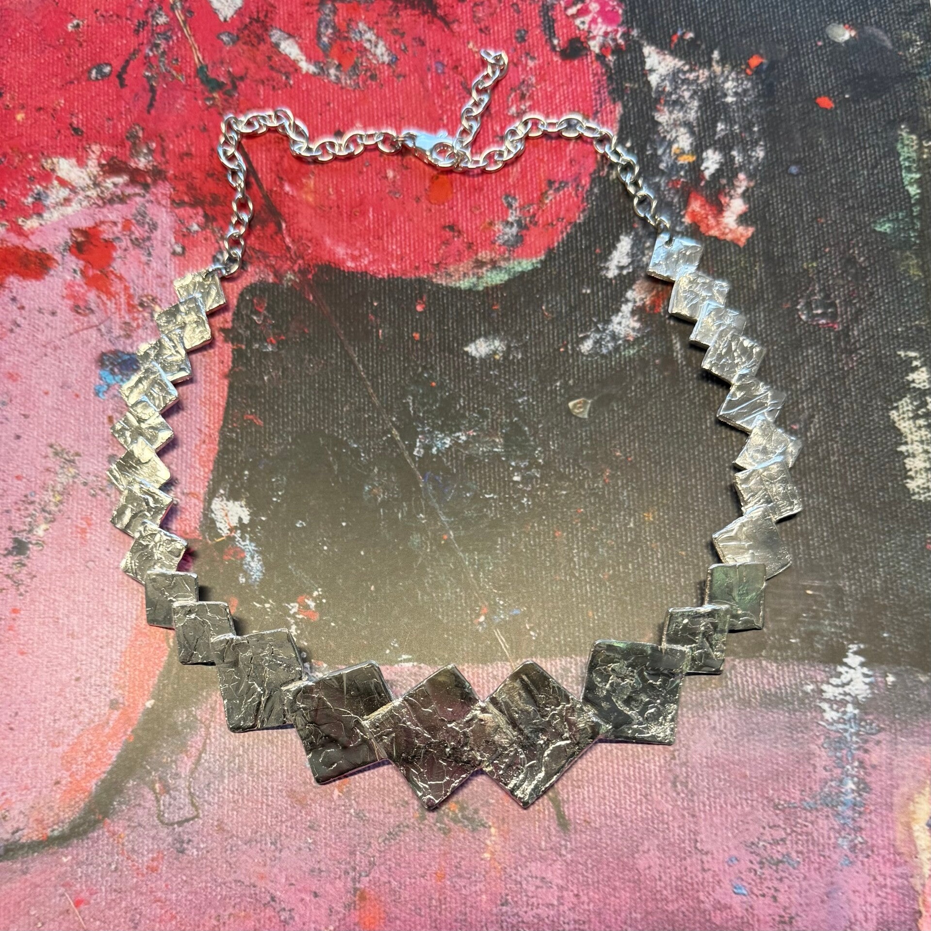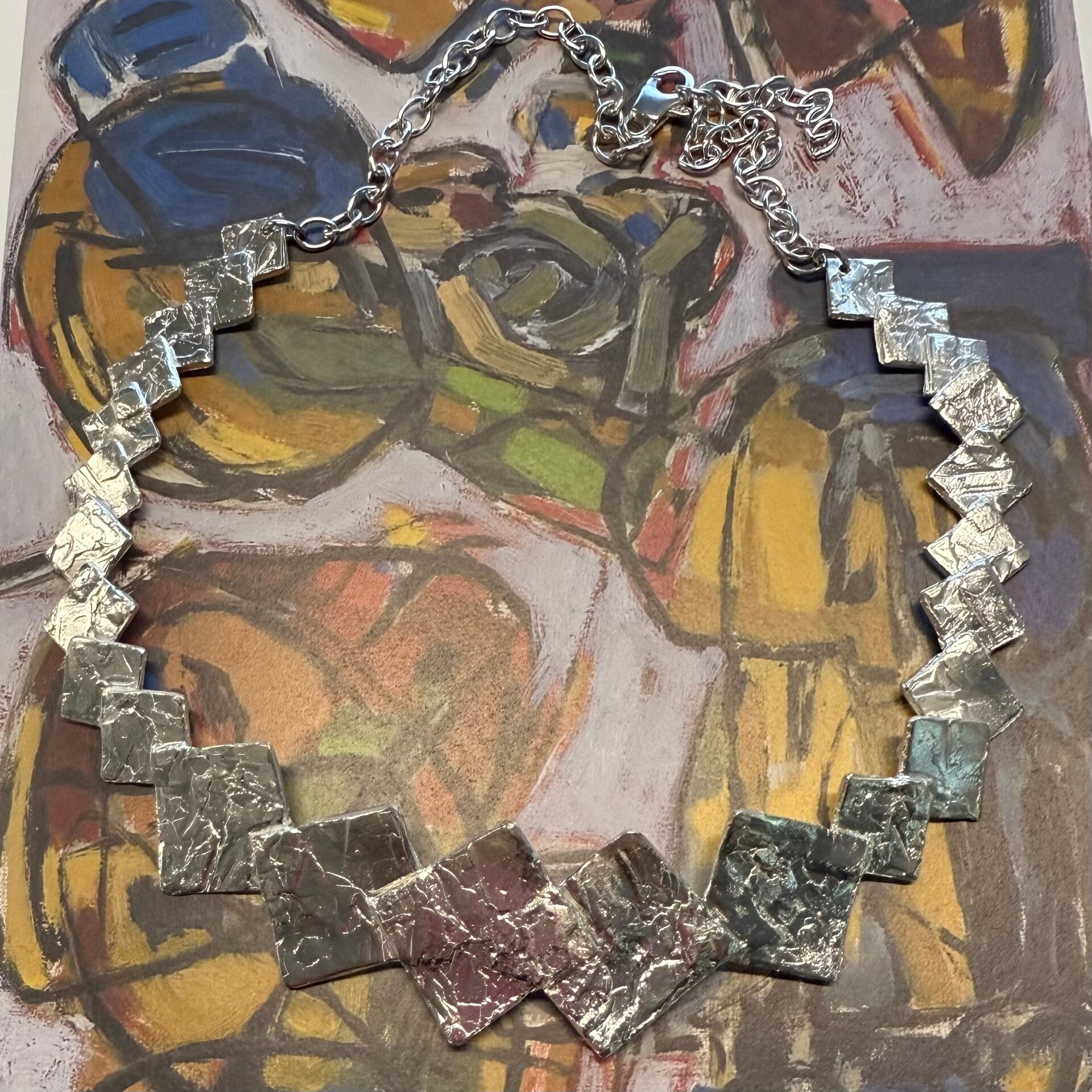 Dit halssnoer werd vervaardigdin Ag925 zilver. Gegoten uit verloren was. Achter in de hals eig een verstelbare ketting. Dus je kan inkorten if verlengen naar behoefte. Op 3 plaatsen plooibasr, dus beweeglijk.