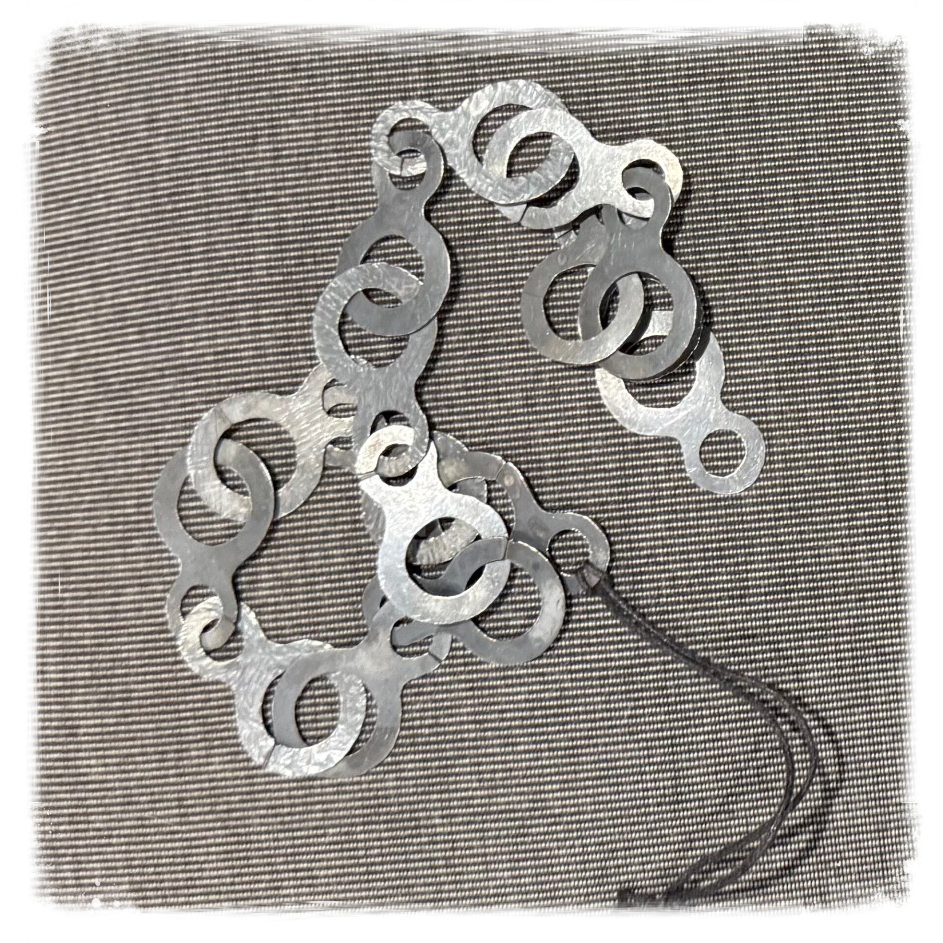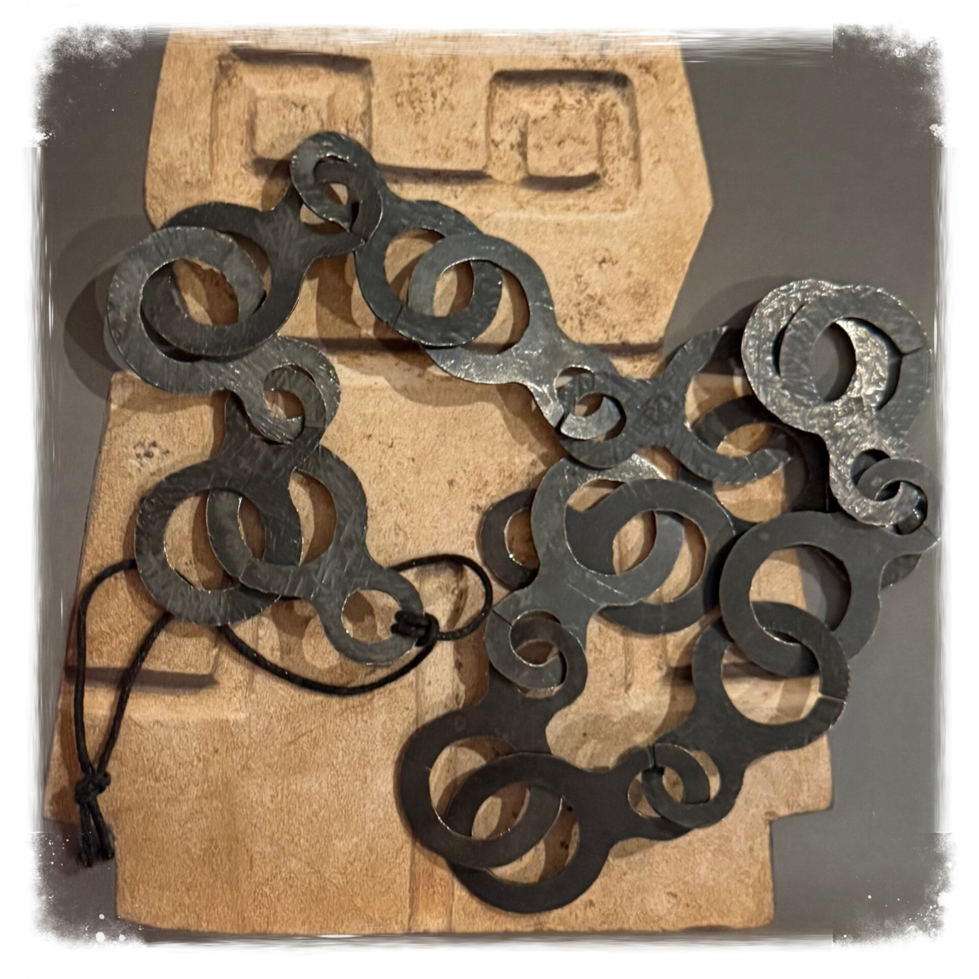 Dit halssnoer werd volledig met de hand uitgezaagd. De schakels zijn in elkaar geschoven. Er zijn geen solderingen op gedaan. Het zilver is gezwart.