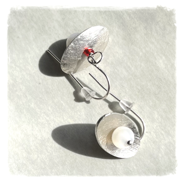 Kelkjes (2 uit hetzelfde lepeltje) met een rood glaskraaltje on top en een witte natuursteen kraal onderaan. frisse combinatie in de zon.