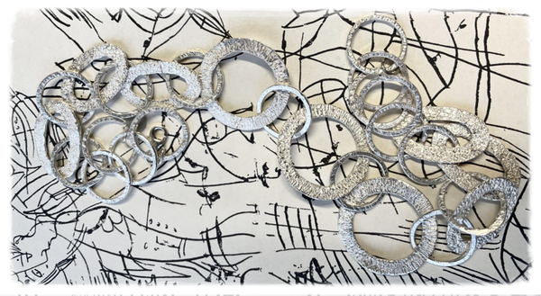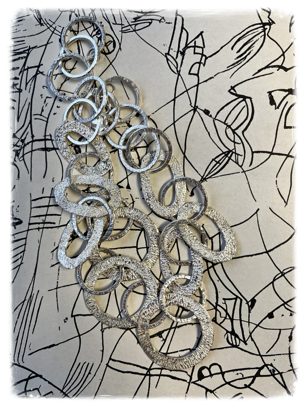 Prachtige ketting met ronde en ovale schakels, gesmeed en gegoten varianten samen. 55cm lang. Grootste schakel een doorsnede 4 cm. Je kan er oorbellen bij combineren zie zelfde naam onder onze rubriek oorsieraden.