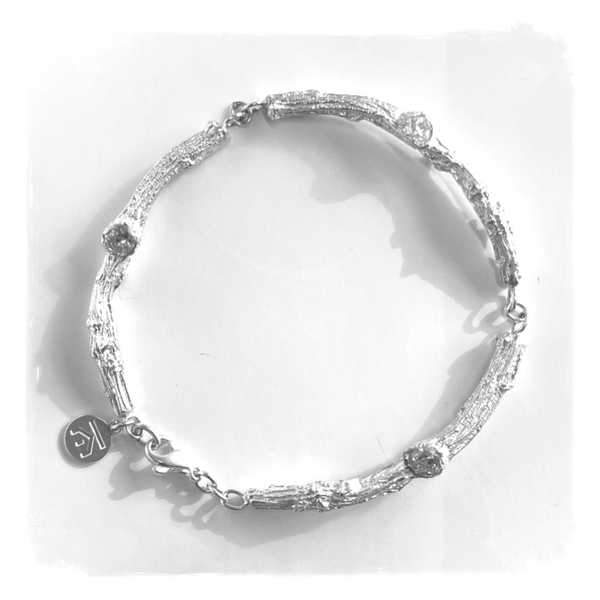 Deze takjes werden uit een écht door mezelf uitgekozen takje gecast. Daarna werden de takjes gebogen en oogjes tussen gezet. Op de knotjes werden zirkonia zettingen geplaatst. Een vernuftig stukje natuurgieting. Er bestaat er maar één van.